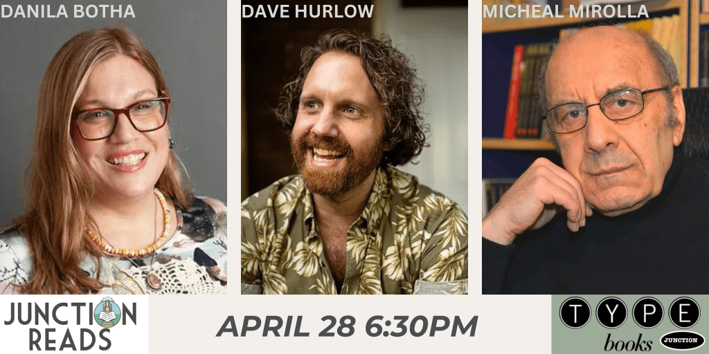 On Sunday April 28, we are back at TYPE Books in the Junction for in-person readings, and a Q and A, with Michael Mirolla, Dave Hurlow and Danila Botha. PWYC at the door or through our Eventbrite page, where you can also access the Zoom event (yes, we livestream our in person events!).