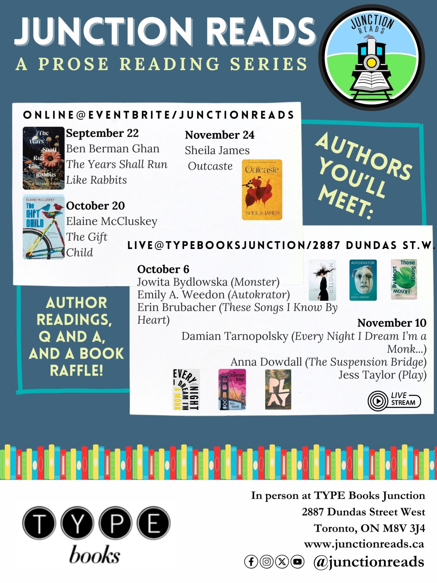 November 10 6:30pm ET (In Person) at TYPE Books Junction with Damian Tarnopolsky (EVERY NIGHT I DREAM…, Freehand Books), Anna Dowdall (THE SUSPENSION BRIDGE, Radiant Press) and Jess Taylor (PLAY, Book*hug Press)