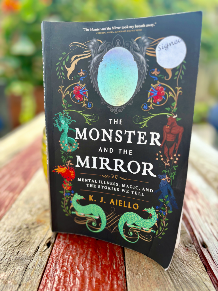 There is much to admire about K.J. Aiello’s book, THE MONSTER AND THE MIRROR. An exploration of mental illness, society’s perceptions with all its biases and tropes (so exploited and abused in film and television—why must mentally ill people always be the villain??), and a deeply personal journey through the liminality of mental illness when one lives between what is actual, and what is fantastically AND concretely real in the dark corners of our minds.