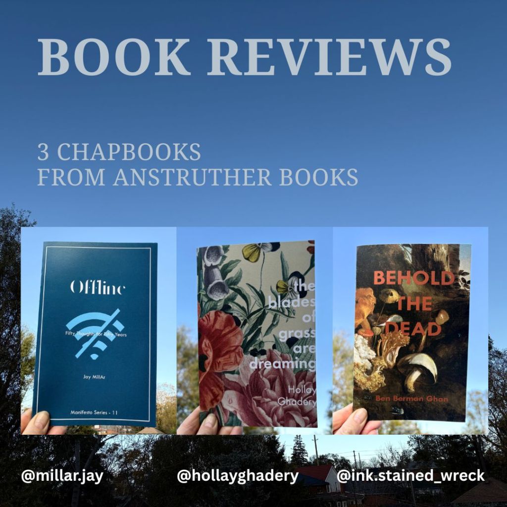 Three chapbooks from Anstruther Books. Jim Johnstone knows a great poem when he sees it! Check out their website for more titles, but you can read my very non-literary reviews of three titles. Jay MillAr’s Offline, Hollay Ghadery’s the blades of grass are dreaming, and Benjamin Berman Ghan’s BEHOLD THE DEAD.